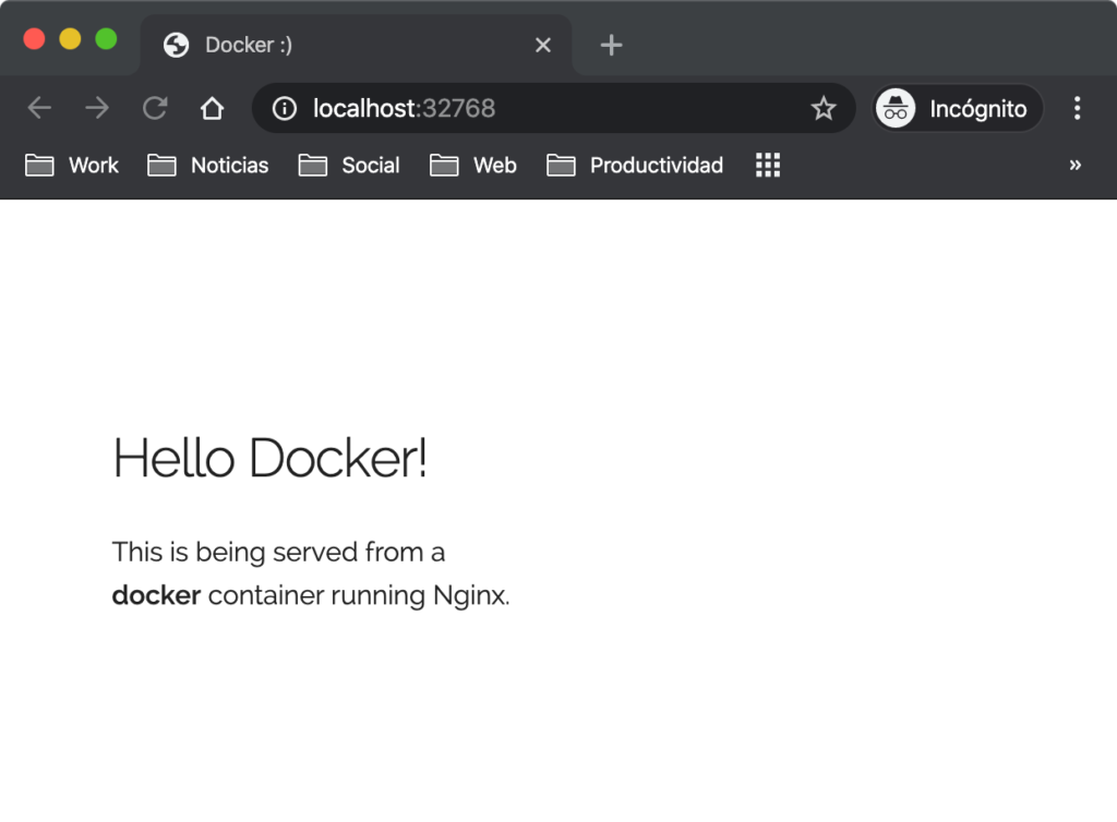 El comando que acabamos de ejecutar usó el puerto 5000 para el servidor dentro del contenedor y lo expuso externamente en el puerto 8888. Dirígete a la URL con el puerto 8888, donde tu aplicación debería estar activa.